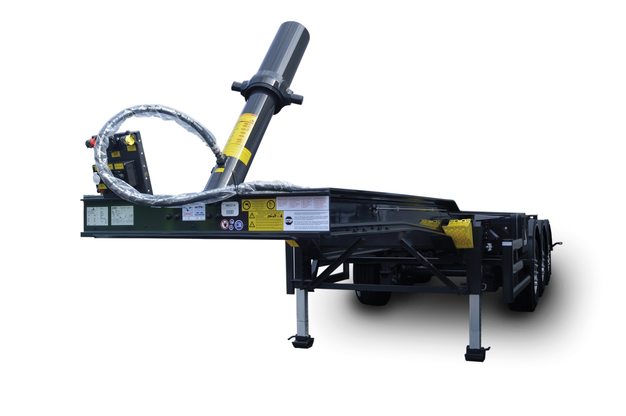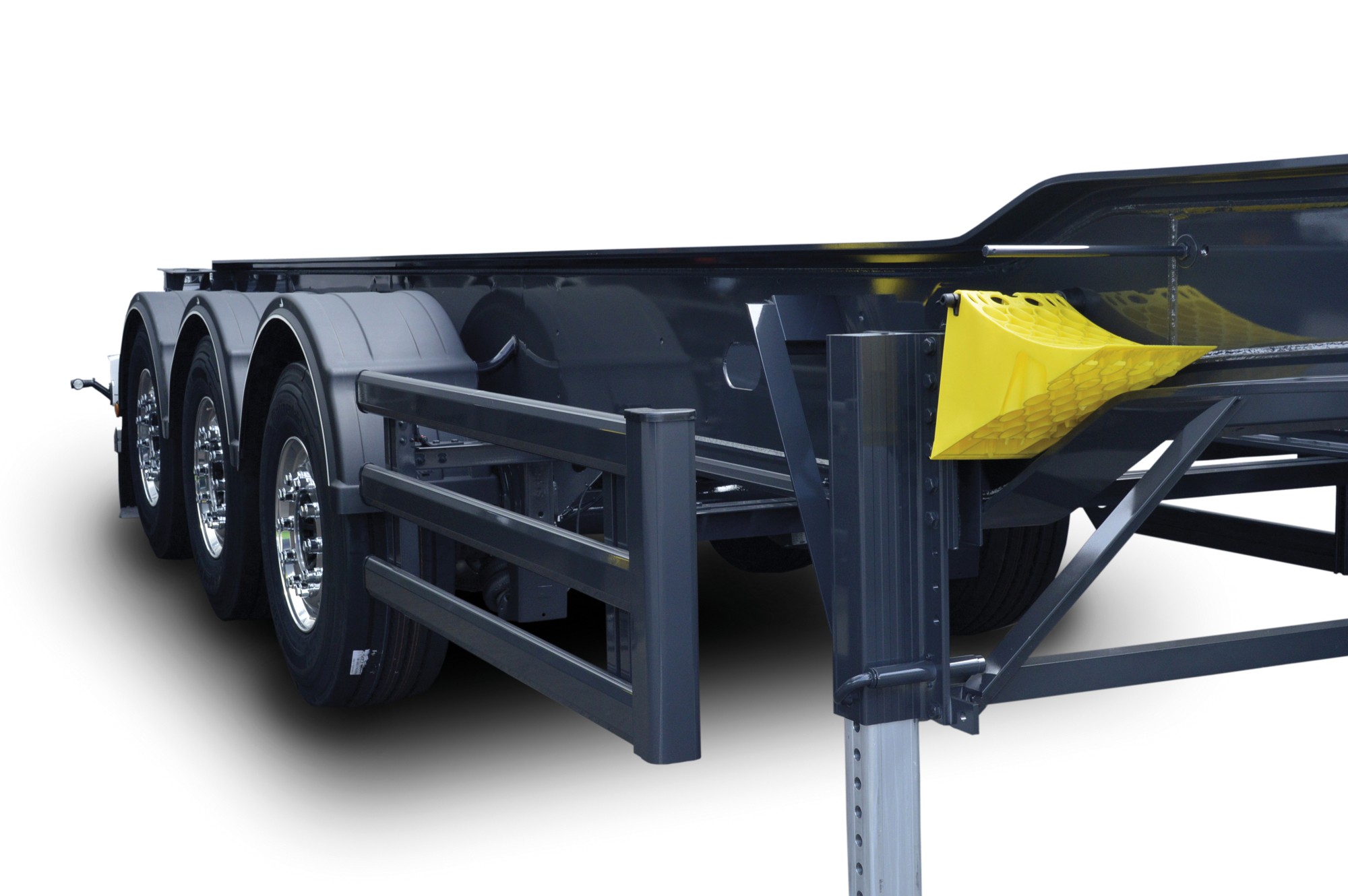 A step frame chassis is a chassis that is lowered from the landing legs to the tail end. The great advantage of this type of chassis is that it is possible to increase the volume without increasing the total height. This allows the height of the trailer to be adjusted for particular types of feeding machines and telescopic handlers. The step frame chassis has the additional, yet important advantage that it slightly lowers the centre of gravity of the loaded semi-trailer. This in turn increases stability and also leads to greater safety.