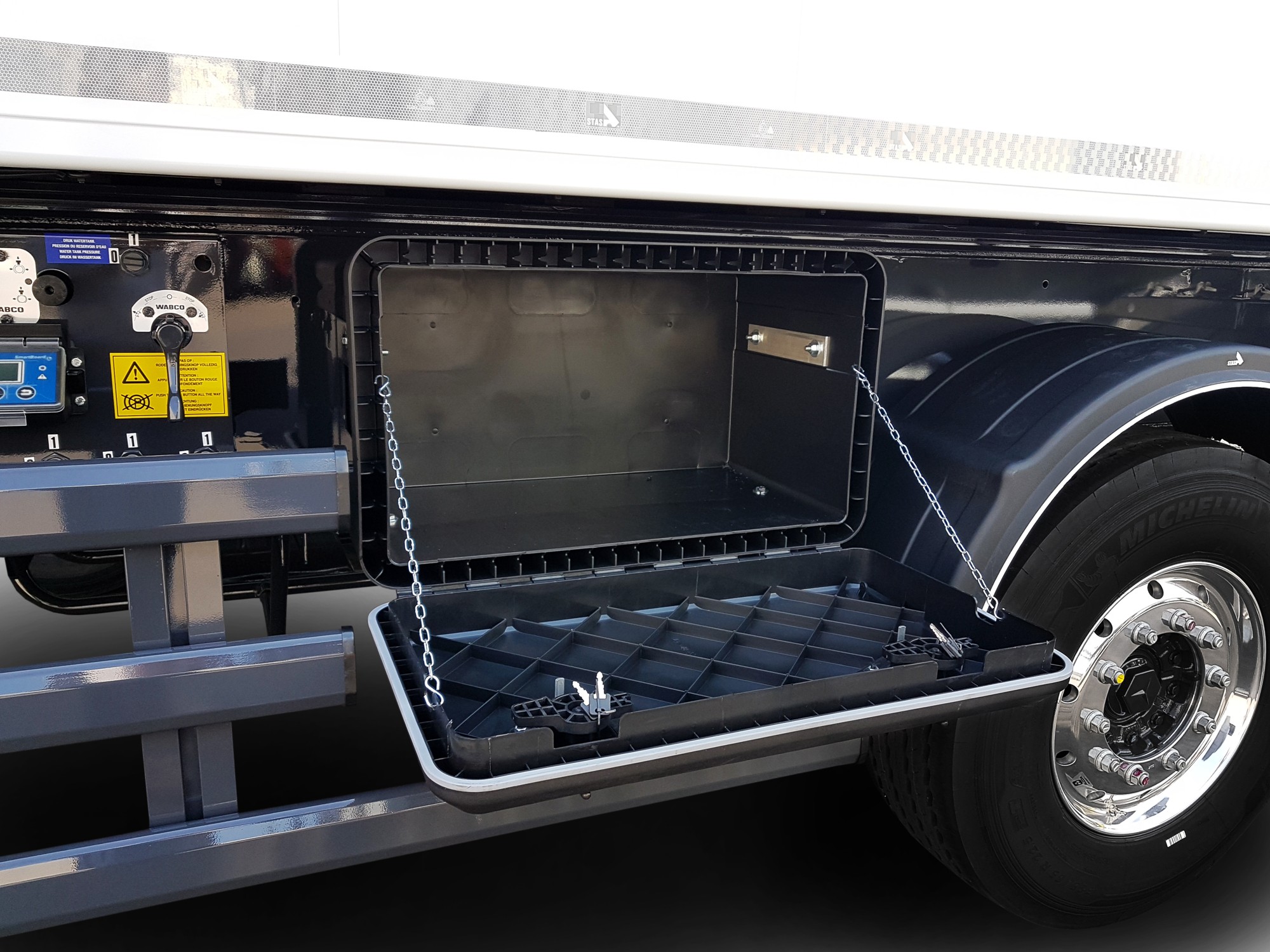 The rock-solid standard toolbox is made from high quality plastic and offers a storage space for any extras that you want to take with you. The toolbox provides a place for all kinds of safety materials and accessories such as safety pins for the bumper. The boxes are also perfectly watertight thanks to the seal and the robust fasteners. The lozenge pattern on the lid provides additional strength when the box is open. The box can be securely locked using the accompanying keys.