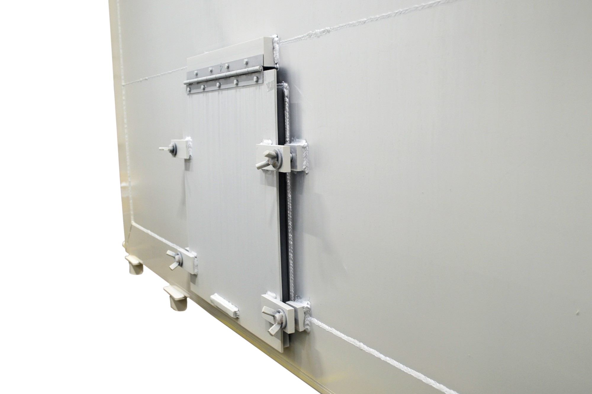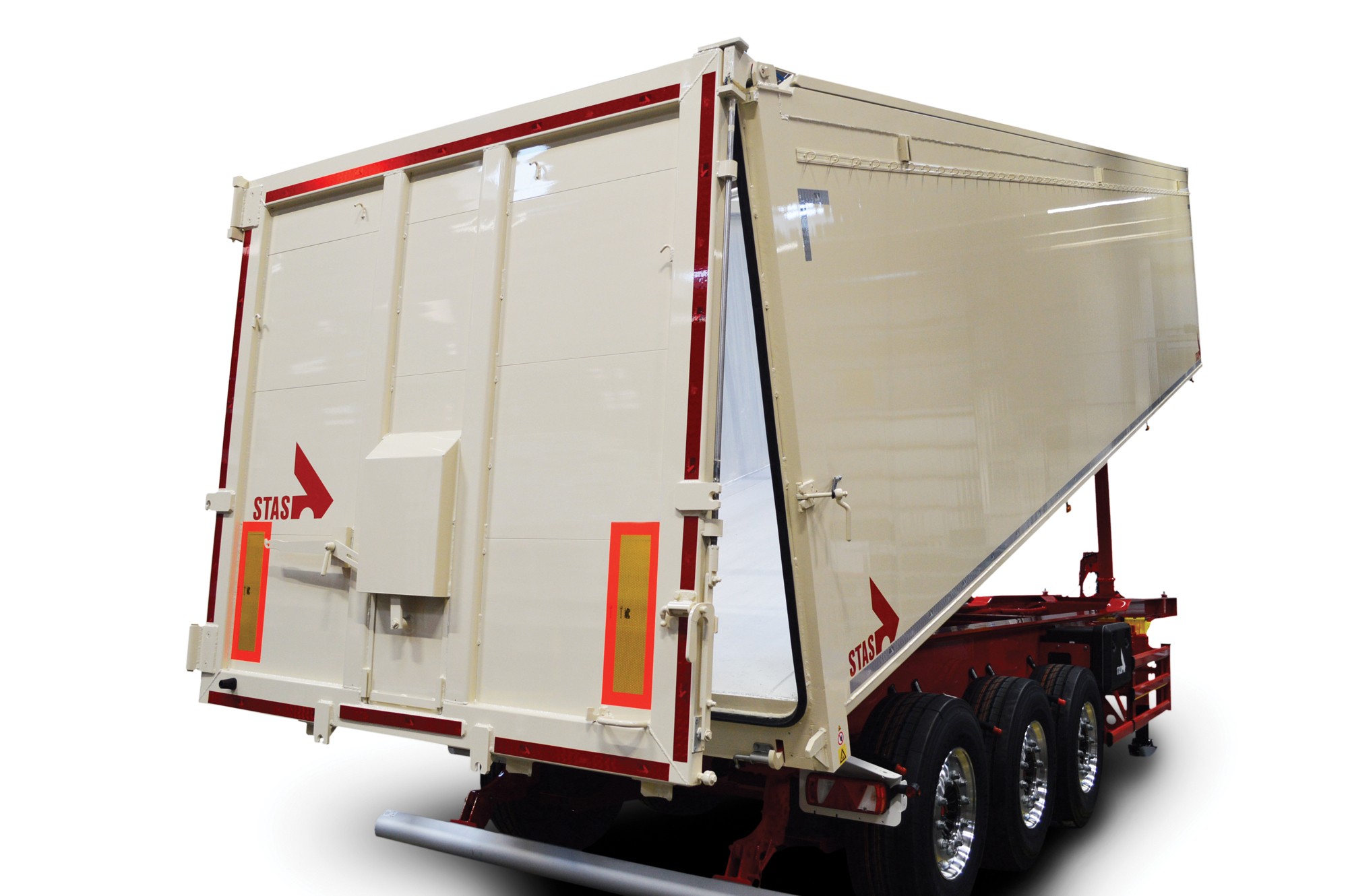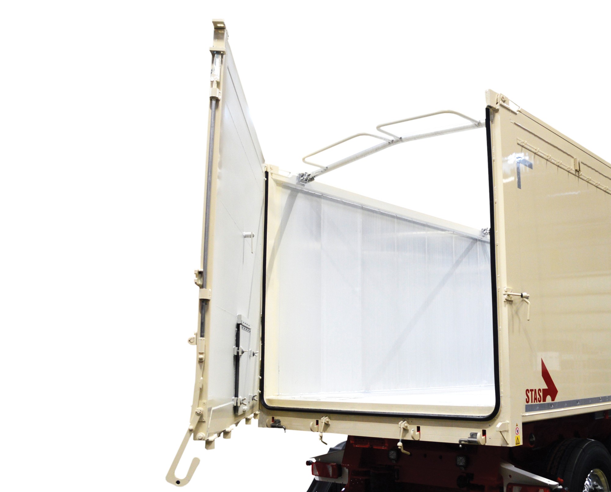 The single-section, double-acting, water-resistant universal rear door is perfect for transporting abattoir waste, fertilizers, vegetables with a high level of residual humidity or other extremely humid loads.