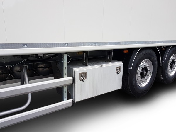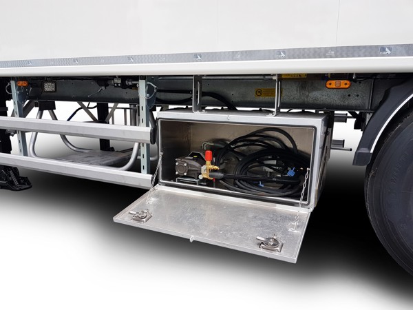 The built-in high-pressure washer allows you to effortlessly keep your vehicle sparkling clean. The high-pressure washer works hydraulically so no external energy source is required. Furthermore, the high-pressure hose is long enough to be able to go around the semi trailer. The high-pressure washer is neatly concealed in a stainless steel tool box that is also lockable.